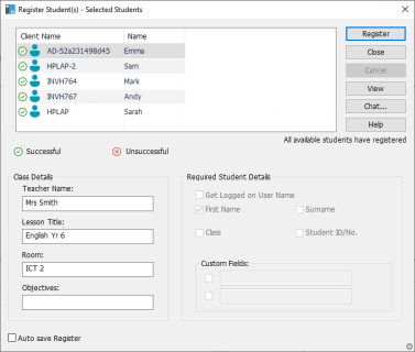 Click Register to send the form to Student machines. You can monitor progress as the Students respond. Click Close when all Students have signed in, the Student icon in the Tutor Console now displays the registered name.