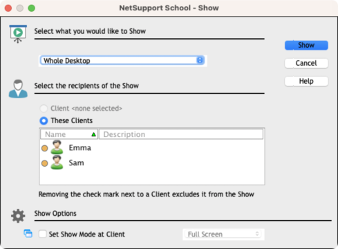 This dialog is used to set which Students to show to. If you are connected to only one Student, or selected a specific Student, they will appear as an individual option. If you only wish to show to this Student, click Show.