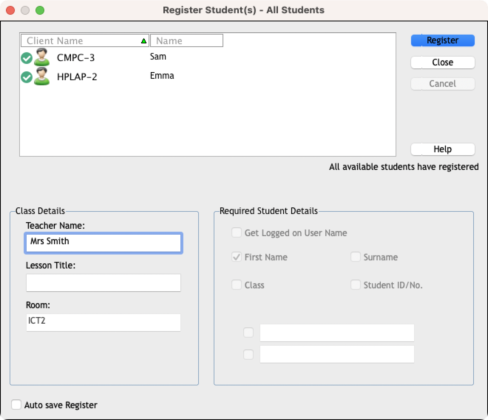 Click Register to send the form to Student machines. You can monitor progress as the Students respond. Click Close when all Students have signed in, the Student icon in the Tutor Console will now display the registered name.