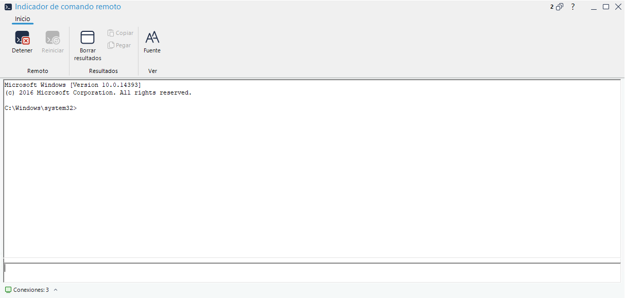 La barra de título indica el nombre del Cliente que tiene abierta la ventana de Instrucción de comando remoto. En el lado derecho están disponibles las siguientes opciones: