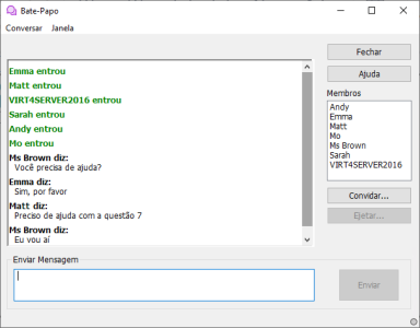O corpo principal da Janela Conversar é usado para registrar o andamento da sessão. Ele guarda detalhes de membros que entraram ou saíram da discussão e as mensagens enviadas por cada um.
