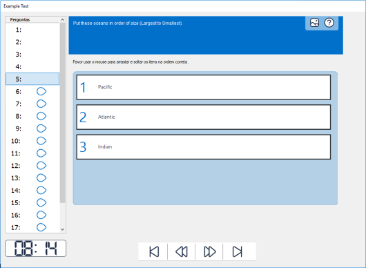 Botões numerados indicam quantas perguntas existem na prova. O Aluno pode clicar neles para passar rapidamente de uma para a outra. É útil no final da prova para revisar as respostas e fazer as últimas mudanças antes de acabar o tempo.