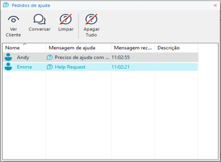 Quando o pedido de ajuda estiver tratado, clique no pedido do Aluno necessário na janela Pedidos de Ajuda e clique em Limpar ou clique com o botão direito do mouse no ícone do Aluno necessário e clique em Limpar. Para excluir todos os pedidos de ajuda, clique em Excluir todas na janela Pedidos de Ajuda. Um Aluno também pode limpar os pedidos de ajuda anteriores no diálogo Pedir Ajuda.